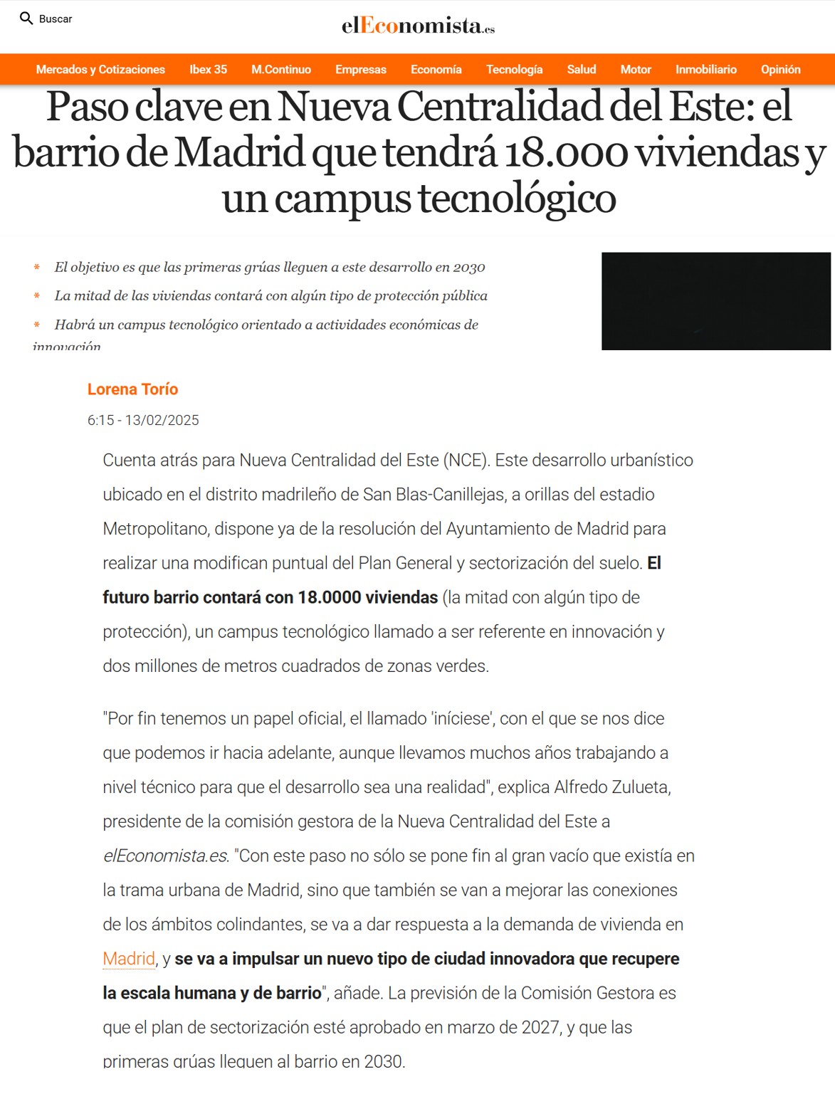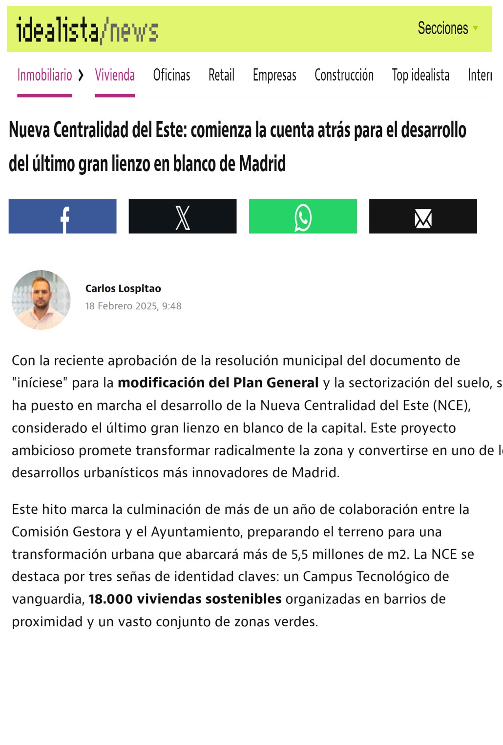 Comienza la cuenta atrás para el desarrollo de Nueva Centralidad del Este (NCE), ya que el Ayuntamiento de Madrid ha dado los primeros pasos para la modificación de Plan General y sectorización del suelo, según informó en un comunicado la Comisión Gestora.